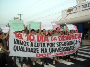 Estava decidido que não haveria aula e foi assim que com cerca de 40 estudantes passamos pelas salas chamando os outros estudantes a luta. Falávamos “o estudante quer qualidade e segurança na universidade”; “vem, vem, vem pra luta vem”. Alguns professores em apoio liberavam suas turmas. Estava dada a mobilização. Ocupamos, como forma de chamar atenção do governo do estado e prefeitura, a Av. Senador Lemos por várias vezes explicando aos motoristas nossa manifestação, declarando nossos motivos aos grupos de imprensa que apareciam. Às 19h nos encaminhamos para a audiência pública, onde ampliamos a discussão sobre a universidade, falamos da importância do policiamento, do investimento em políticas públicas sociais e da participação da universidade no desenvolvimento da comunidade e combate às mazelas sociais. Ressaltamos a necessidade do investimento em pesquisa e extensão para que a universidade cumpra seu papel social de dar respostas aos problemas da sociedade, ajudando assim, de fato, para o desenvolvimento da Amazônia.